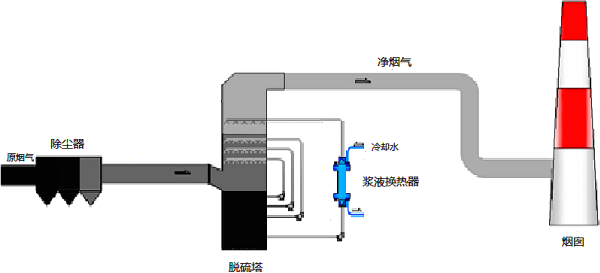 在煙道外,運(yùn)行環(huán)境好,可靠性高,易維護(hù);降溫段/升溫段換熱器換熱量小,體積小,阻力小。系統(tǒng)可靠,即便是煙氣再熱系統(tǒng)故障停用,漿液冷卻系統(tǒng)的煙氣減白作用仍很強(qiáng)。如采用熱風(fēng)加熱方案,煙道內(nèi)無設(shè)備。