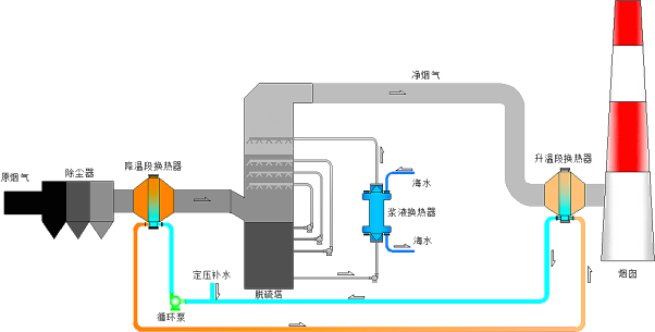 在煙道外,運行環境好,可靠性高,易維護;降溫段/升溫段換熱器換熱量小,體積小,阻力小。系統可靠,即便是煙氣再熱系統故障停用,漿液冷卻系統的煙氣減白作用仍很強。如采用熱風加熱方案,煙道內無設備。