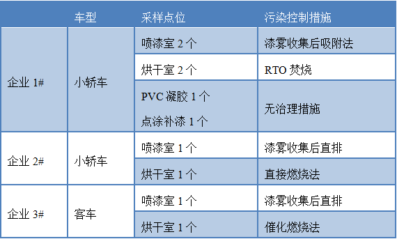 采用源排放測試了解企業排氣筒VOCs排放濃度水平與物種組成。企業類別、廢氣處理設施與采樣情況如表1所示,包括采用不同尾氣處理措施的兩家小轎車生產企業,以及1家輕型客車生產企業,重點針對排放量大的噴漆室和烘干室進行采樣測試,