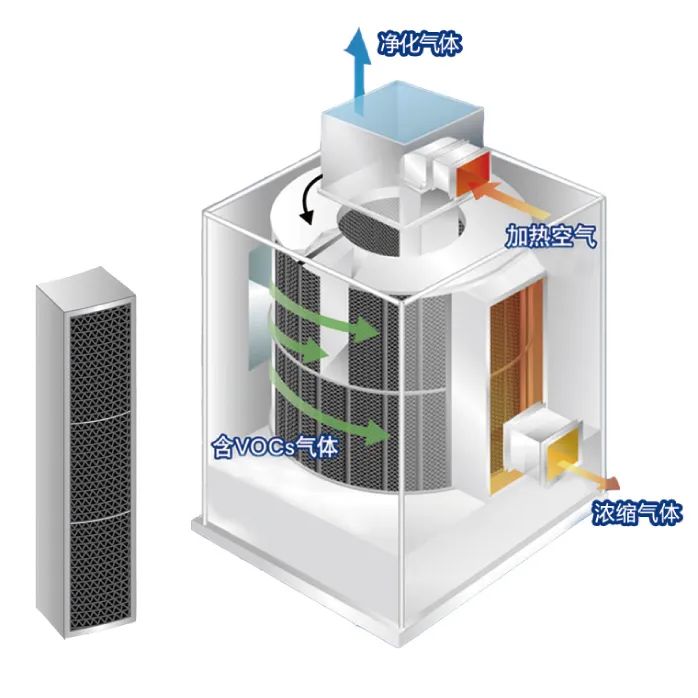 筒式沸石轉輪來自日本東洋紡,除了材料加工上的差異,從結構上和盤式有很大的區別,利用模塊化沸石材料填充成筒狀結構,來實現VOCs的吸附濃縮。